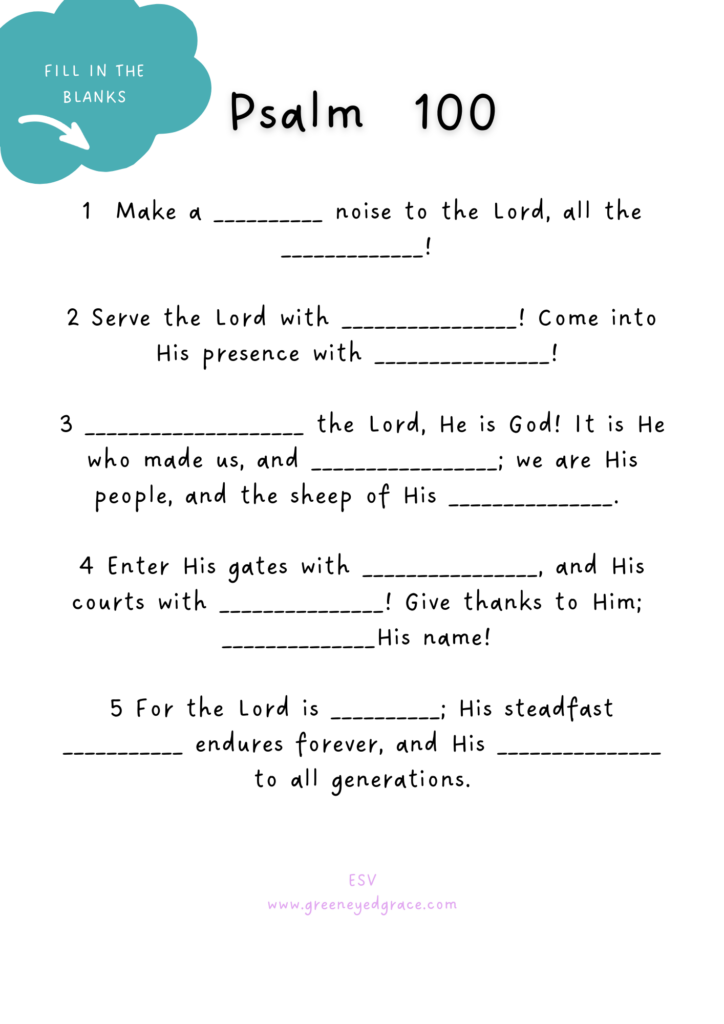 Here is a handy little worksheet to practice meditating on scripture. If you click on any of the images in this blog post, you can get the FREE printables. You will see the entirety of Psalm 100 written out, as well as your cheat sheet. Then you can use the fill-in-the-blank to help with memorization and meditation.