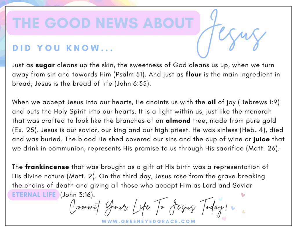 Just as sugar cleans up the skin, the sweetness of God cleans us up, when we turn away from sin and towards Him (Psalm 51). And just as flour is the main ingredient in bread, Jesus is the bread of life (John 6:35).