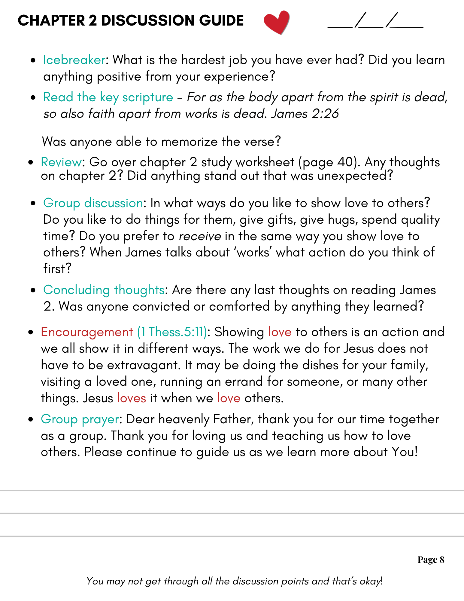 This handy leader guide works in tandem with the Book of James. It makes group study a breeze, especially if you are new to leading Bible Study. It is broken down into 5 sections, just like the book, and is easy to use. Each section gives you different ideas on questions to ask during group discussion. Build lasting friendships and deepen your relationship with the Lord with this convenient leader guide.